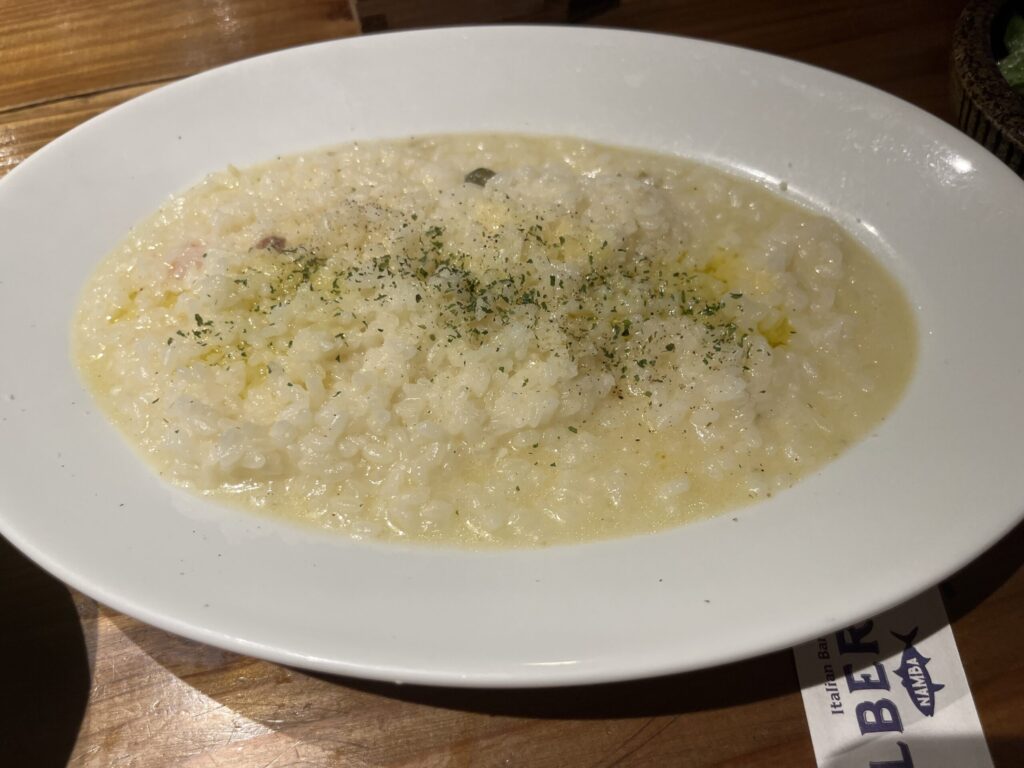 これは先ほどのアクアパッツァを注文した人だけが追加で頼めるメニュー。先ほどのスープをチーズリゾットにしてくれたのだが・・・これが一番うまかった!!魚貝のダシをしっかり吸い込んだリゾットにパルメザンチーズが最高である。