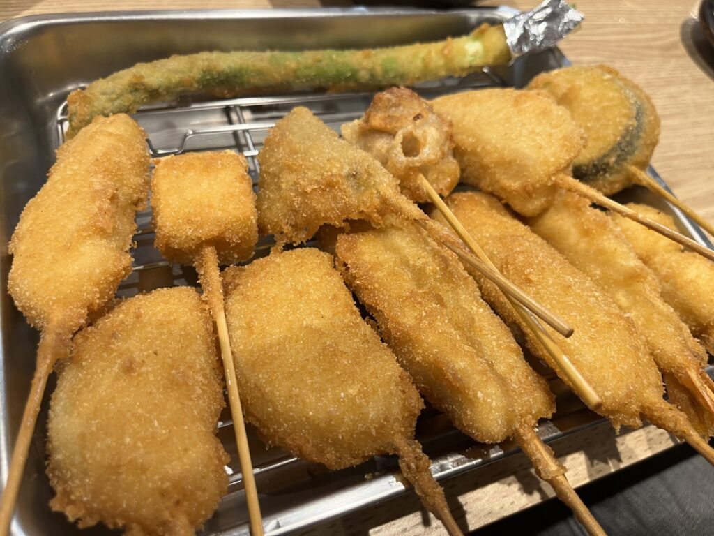 肝心の串カツ。これは”しろたやセット”で、串カツ(牛)、豚カツ、玉ねぎ、えび、うずら、なす、山芋、シュウマイ、アスパラガス、の9種類。写真では2、3本同じ物を単品追加している。