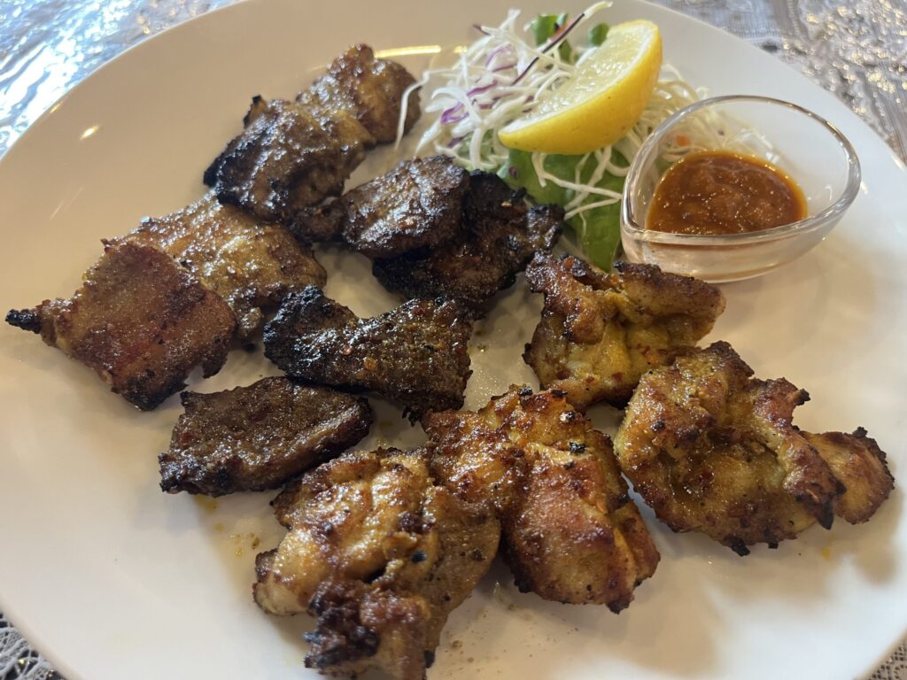 タンドリーチキンが数種類の肉で作られている、という感じですかね。写真は左から豚バラ・マトン(羊)・チキンである。
