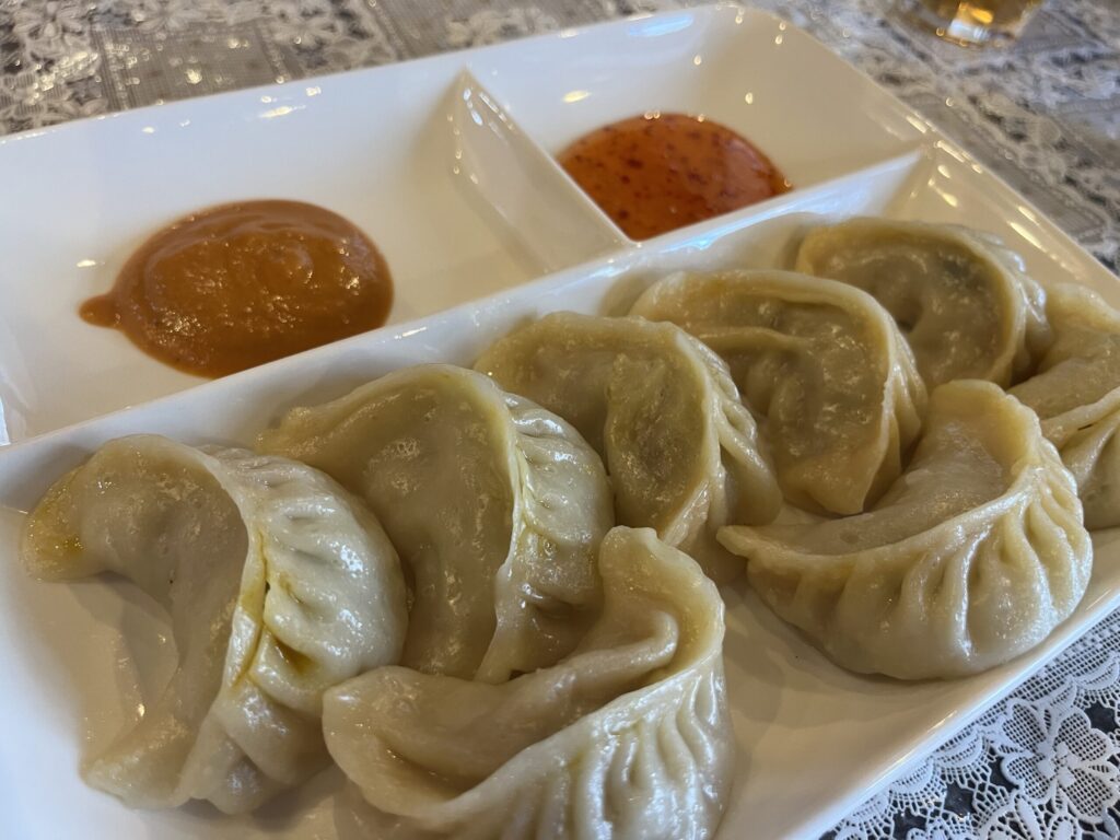 こちらはチキンモモという、ネパール風餃子である。カレーで下味をつけた鶏のひき肉がベースになっており、それを蒸した料理。要は”カレー風味の鶏肉蒸し餃子”ということだ